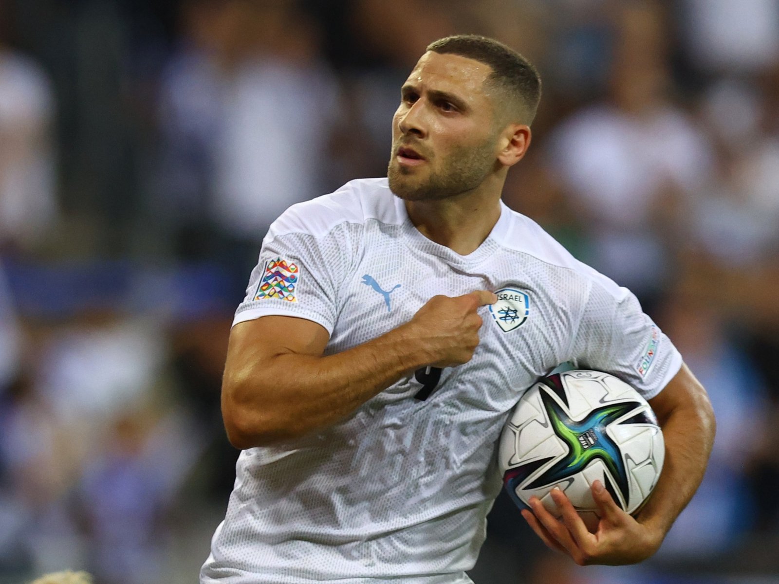 Israël’s Shon Weissman viert het scoren van het tweede doelpunt van zijn team tegen IJsland in een UEFA Nations League-wedstrijd.