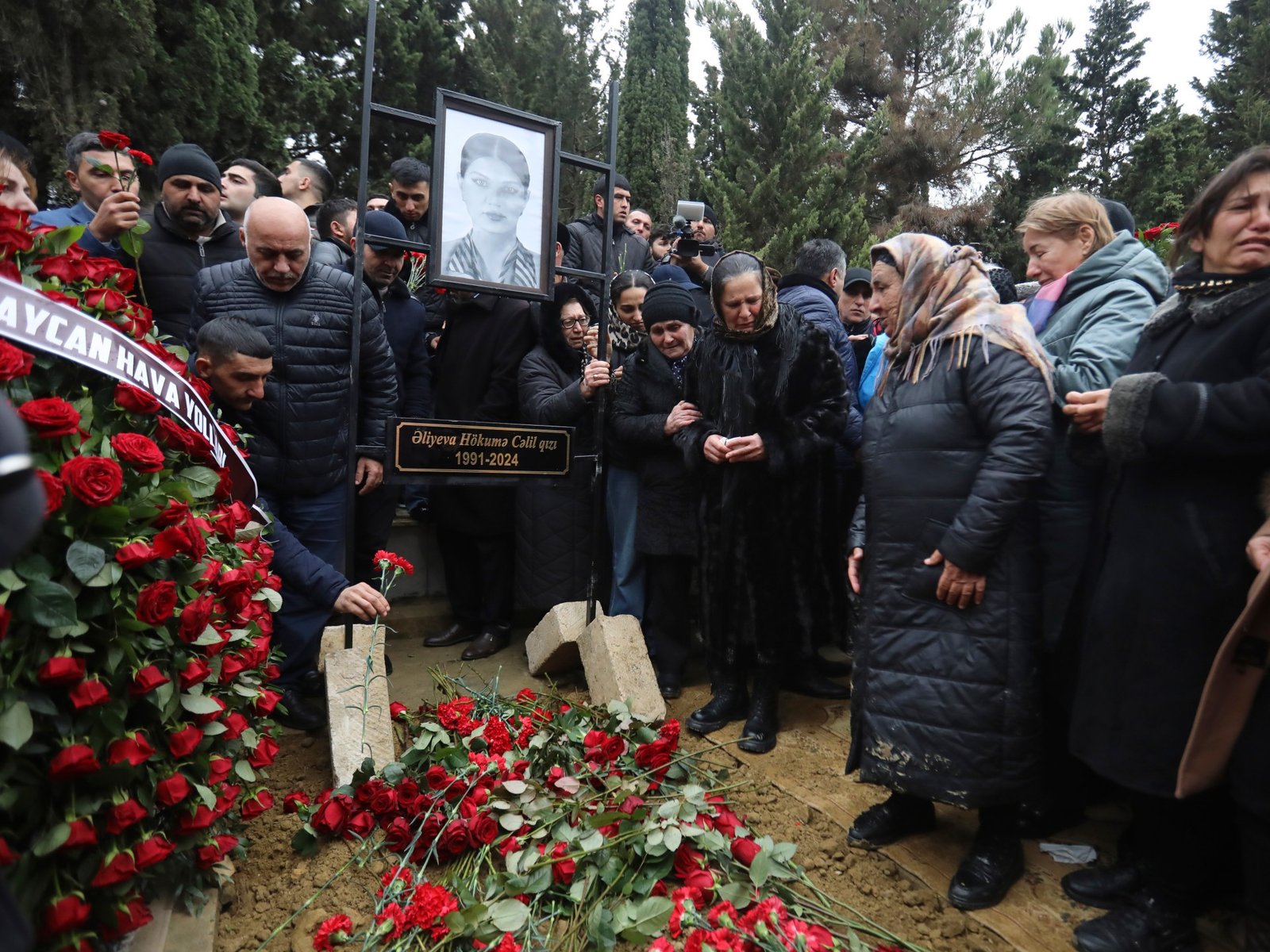 Mensen rouwen bij het graf van stewardess Hokume Aliyeva tijdens de begrafenis van de bemanningsleden van de Azerbaijan Airlines Embraer 190, die deze week omkwamen bij een dodelijk vliegtuigongeluk in Kazachstan, op de II Alley of Honor in Baku, Azerbeidzjan, zondag 29 december 2024.