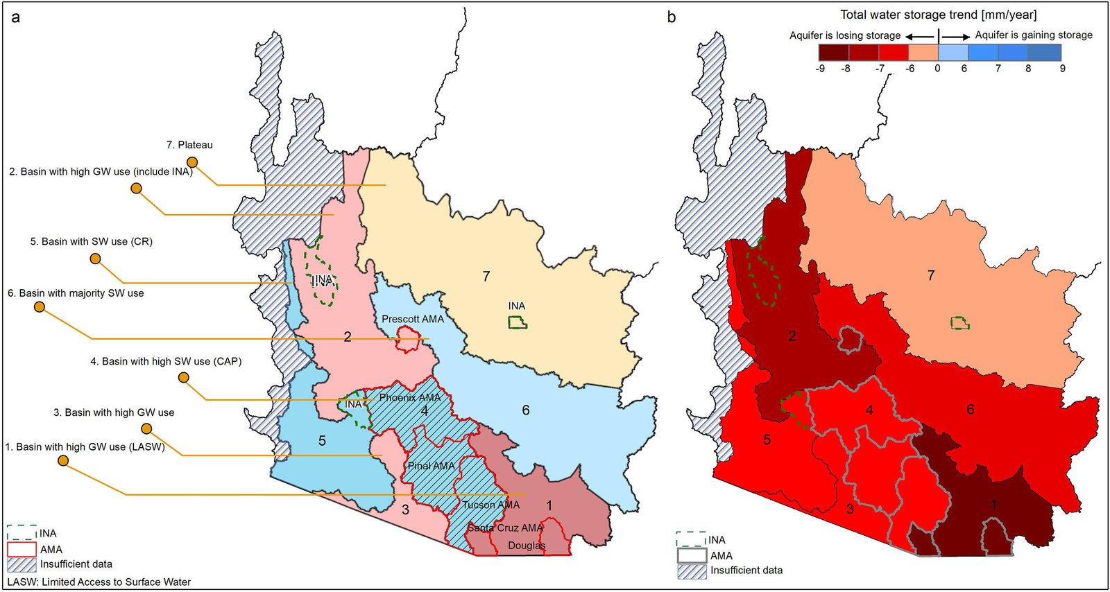 De wetenschappers vonden vooral snelle verliezen aan grondwater in delen van noordwestelijk en zuidoostelijk Arizona, waar grote boerderijen dorstige gewassen zoals luzerne irrigeren, die lokaal worden gebruikt om vee te voeden en ook worden geëxporteerd naar landen zoals China en Saudi-Arabië. Deze gebieden zijn sterk afhankelijk van grondwater en hebben grotendeels geen toegang tot water dat van de Colorado-rivier is afgeleid.