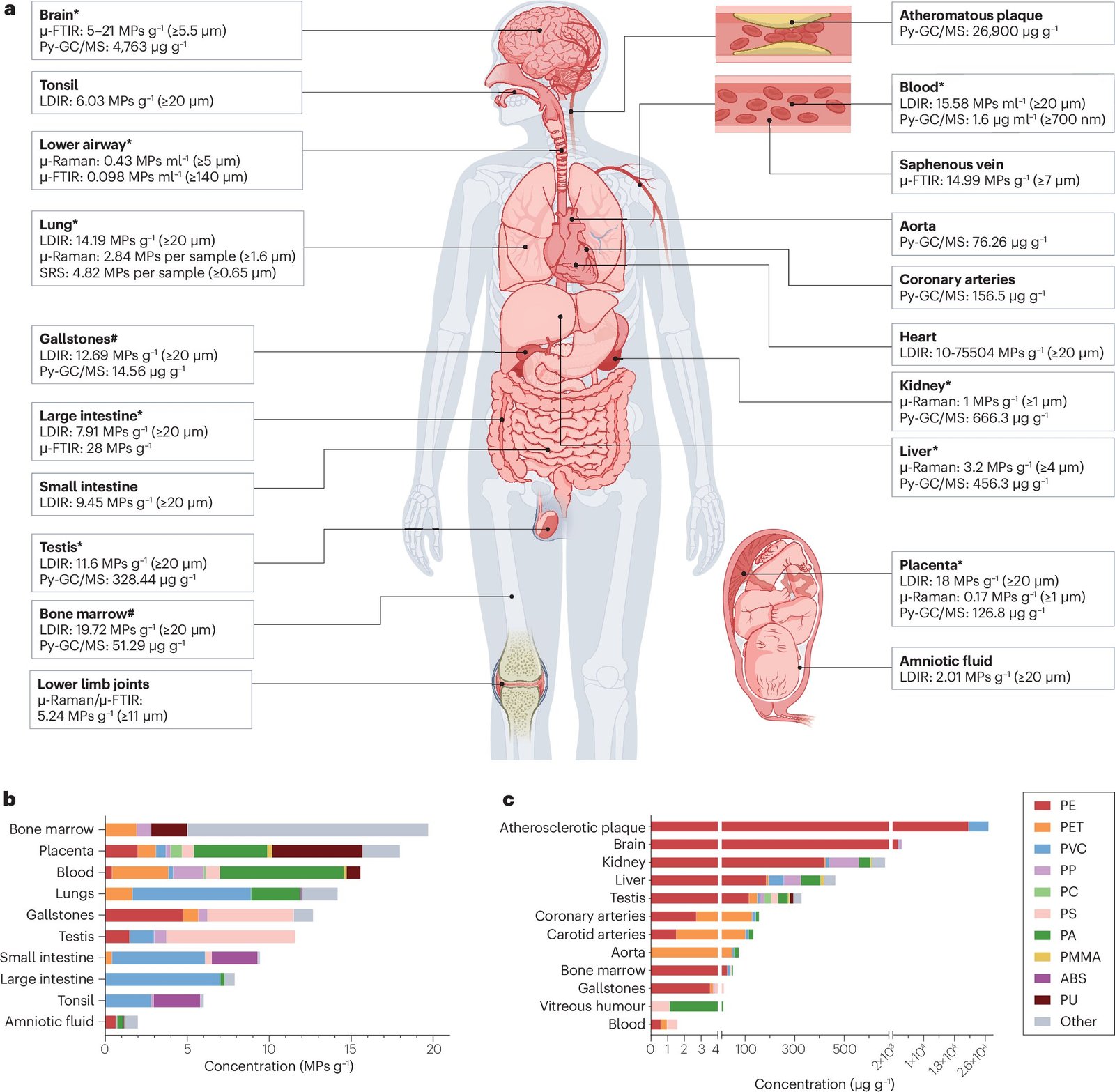 Detectie, concentratie en distributie van micro- en nanoplastics (MNPs) in het menselijk lichaam.