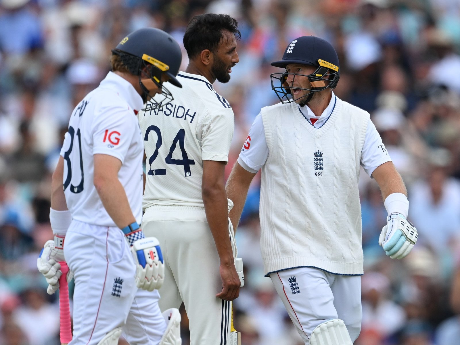 Joe Root en Prasidh Krishna in verhitte uitwisseling tijdens de tweede dag van de 5e Test