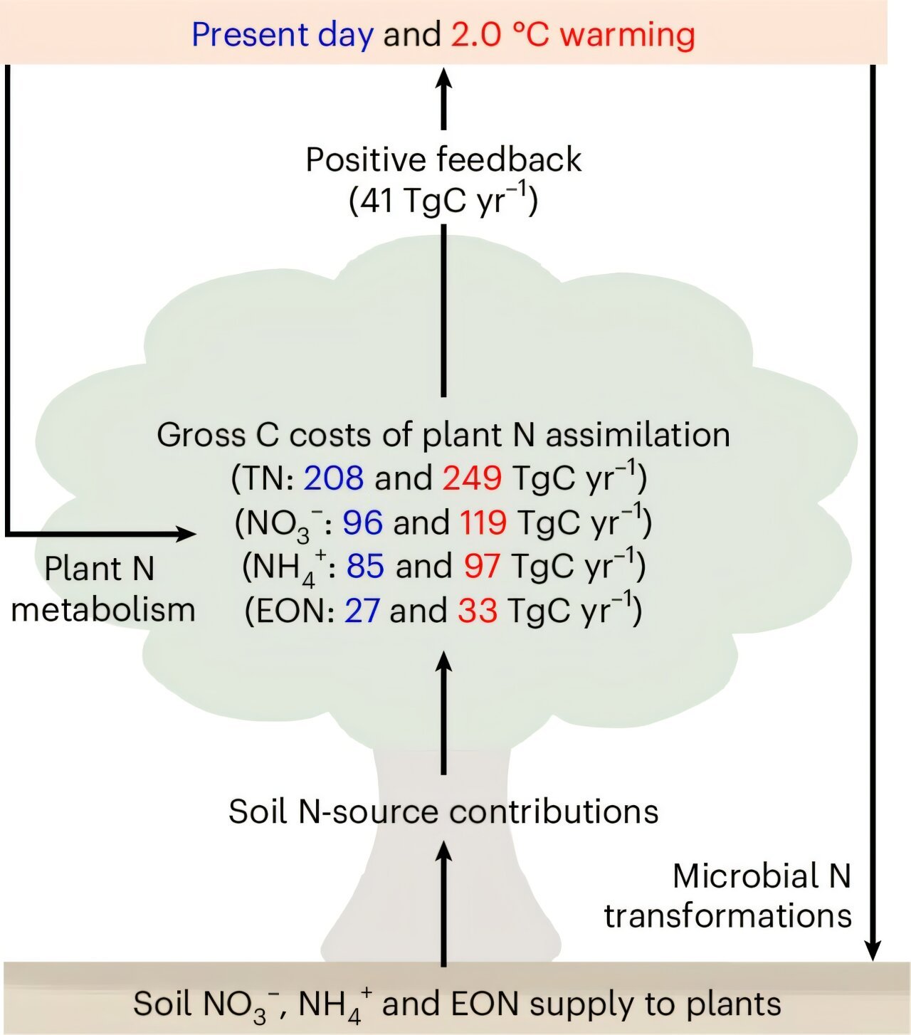 Klimaatopwarming verhoogt de beschikbaarheid van inorganisch stikstof in de bodem en de bijdrage ervan aan de totale stikstofassimilatie door planten. Echter, het verhoogt ook de metabole koolstofuitgaven gerelateerd aan de stikstofassimilatie door planten, wat een deel van de koolstof die via fotosynthese is gewonnen, compenseert. Dit effect is vooral significant op hoge breedtegraden.
