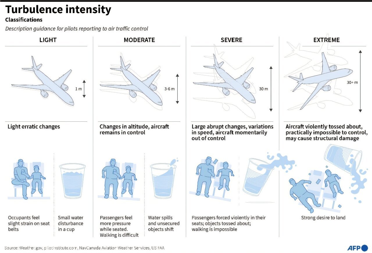 “Typisch zijn verwondingen (aan) niet-gordelgebonden passagiers of cabinepersoneel in plaats van structurele schade,” vertelde John Abraham, professor werktuigbouwkunde aan de Universiteit van St. Thomas, aan AFP. “Moderne vliegtuigen kunnen turbulentie weerstaan, dus het grootste risico is letsel van de inzittenden, niet verlies van het vliegtuig.”