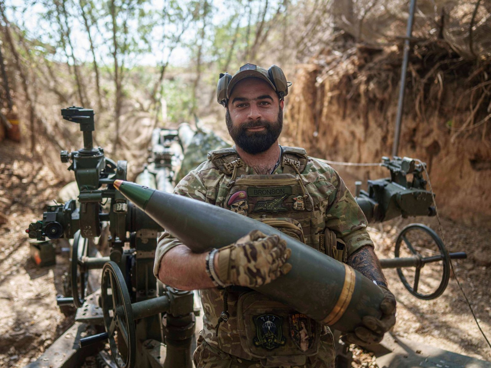 Een Oekraïense soldaat van de 148ste artilleriebrigade draagt een 155mm granaat voor een M777 houwitser aan de frontlinie in de regio Zaporizhia, Oekraïne, op 7 augustus 2025.