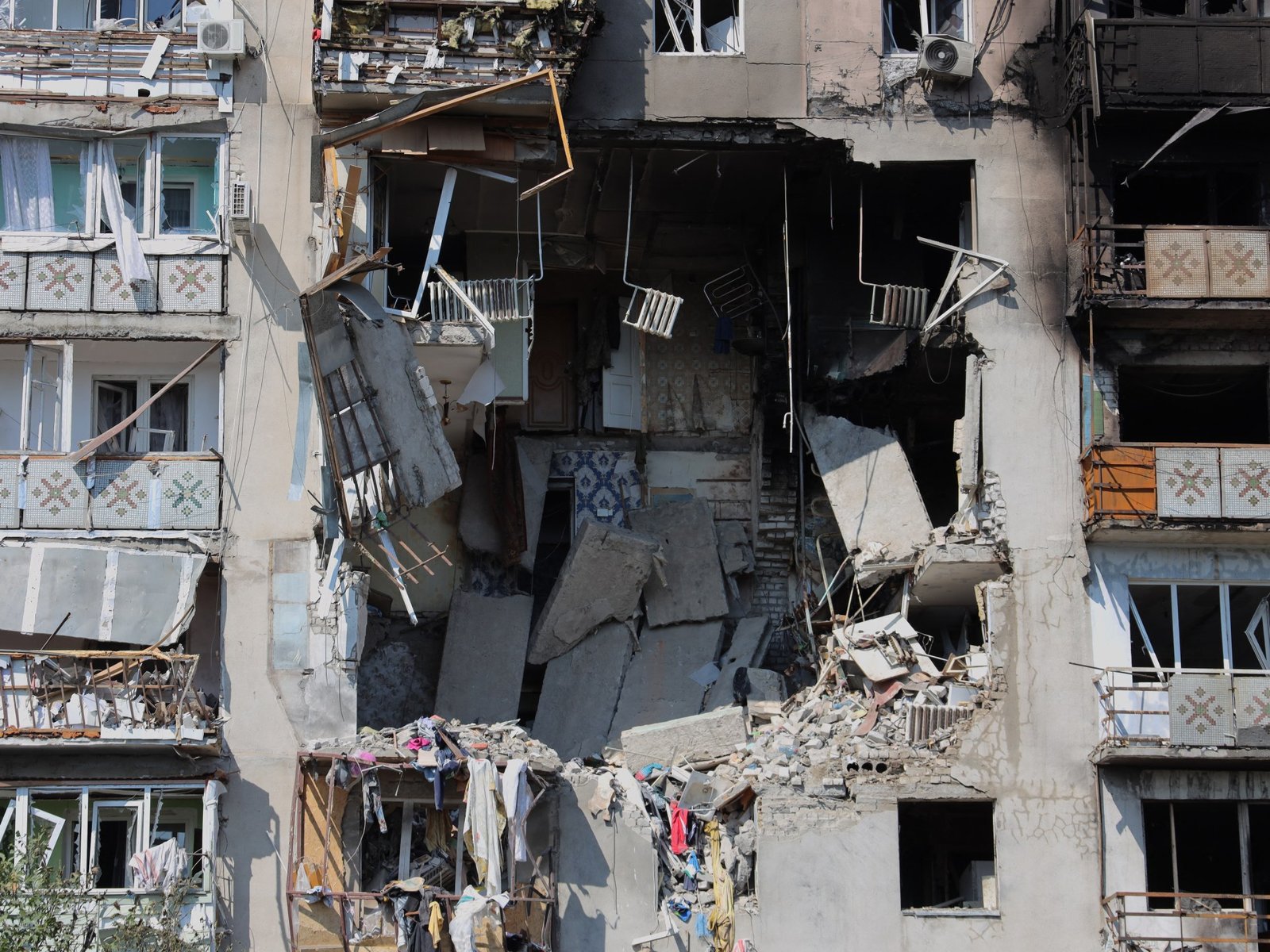 Een woongebouw in Odesa, Oekraïne, beschadigd door een Russische drone-aanval tijdens de nacht.