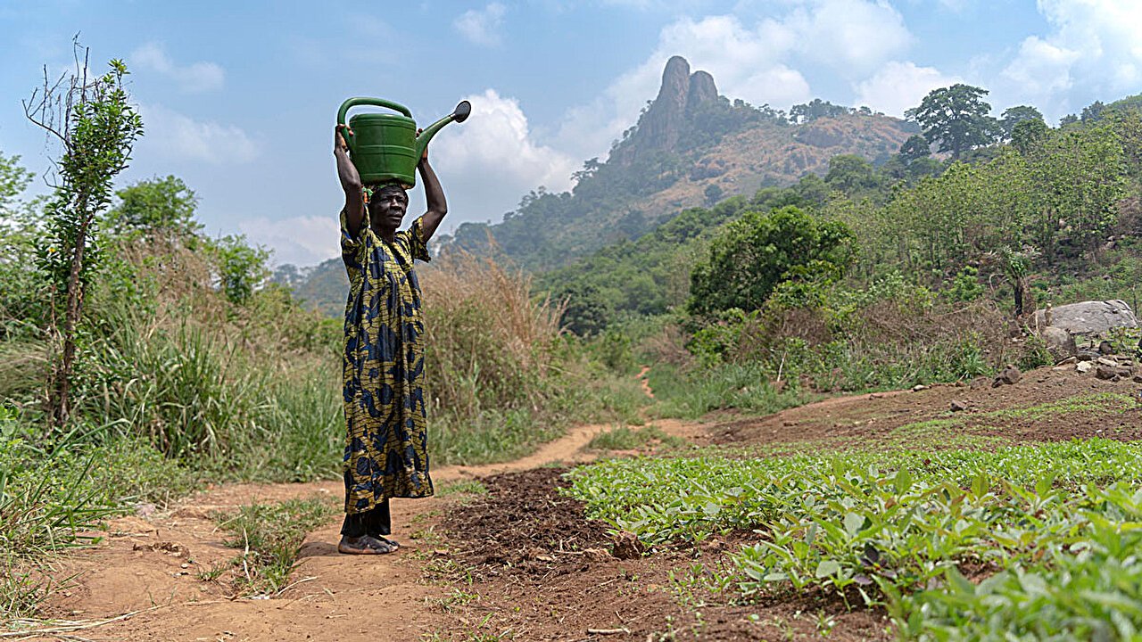 Een vrouw draagt water aan de voet van de Dent de Man-berg in Ivoorkust.