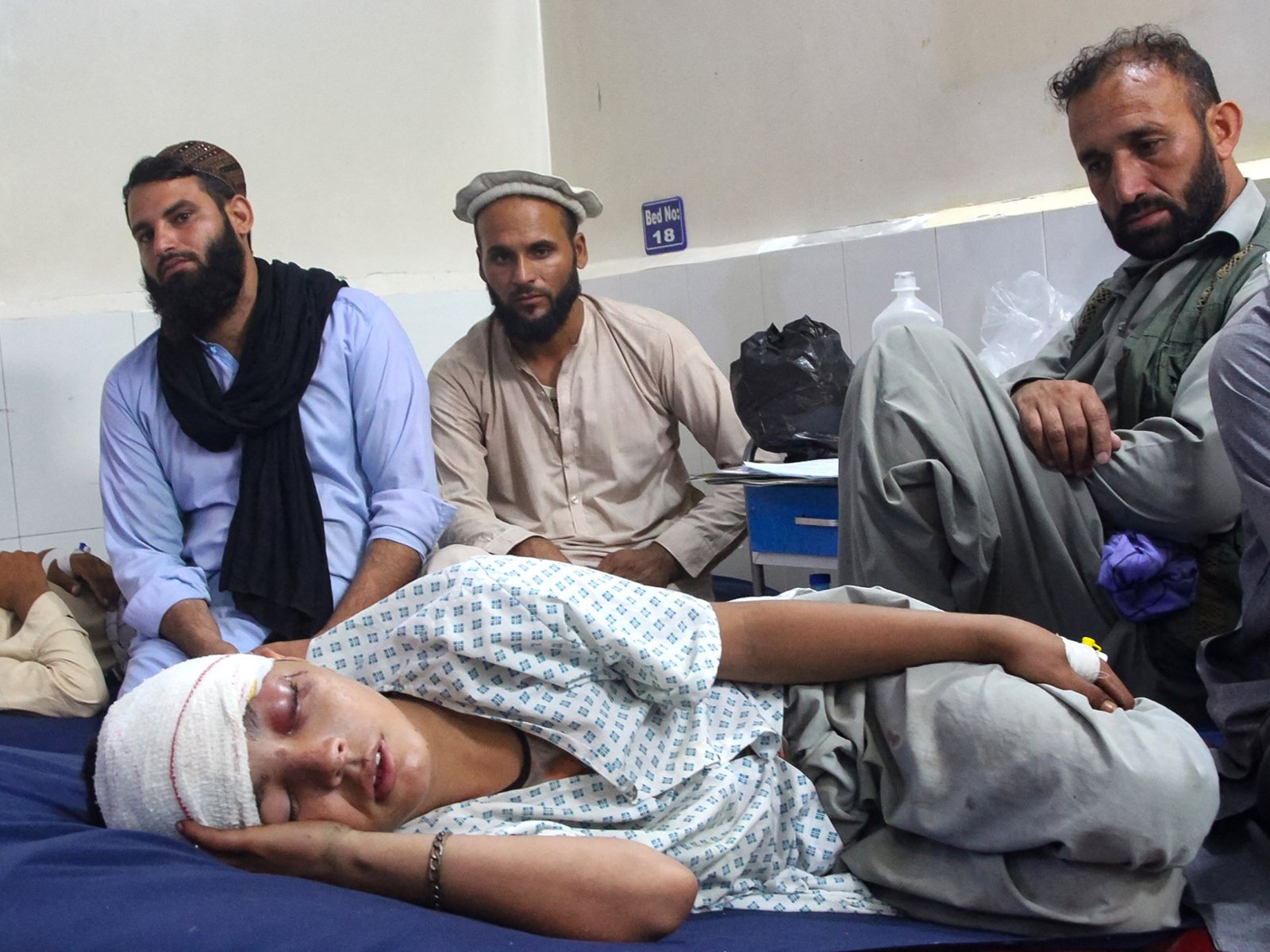 Ingewonden Afghaanse jongen ontvangt behandeling in ziekenhuis na aardbeving in Jalalabad op 1 september 2025.