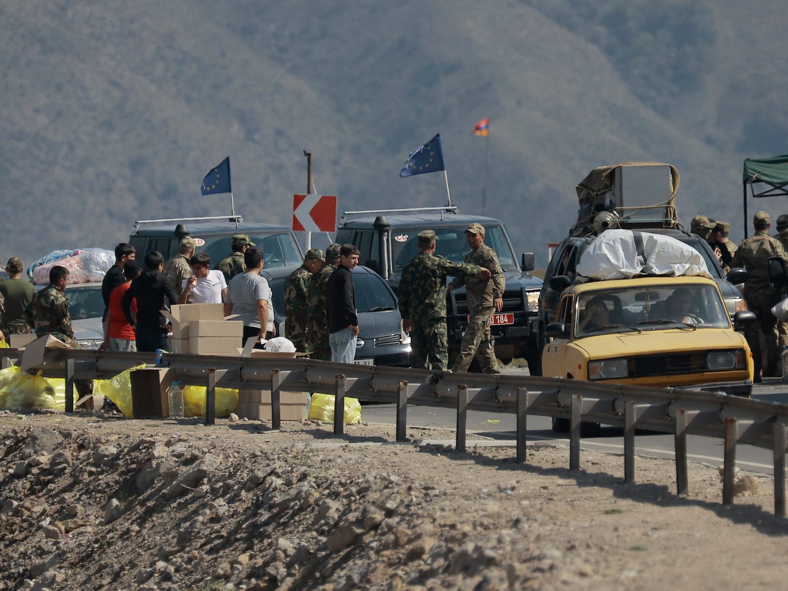 Etnische Armeniërs uit Nagorno-Karabakh en waarnemers van de Europese Unie rijden op 29 september 2023 met hun auto’s voorbij een controlepost op de weg van Nagorno-Karabakh naar Goris in de Syunik-regio van Armenië.