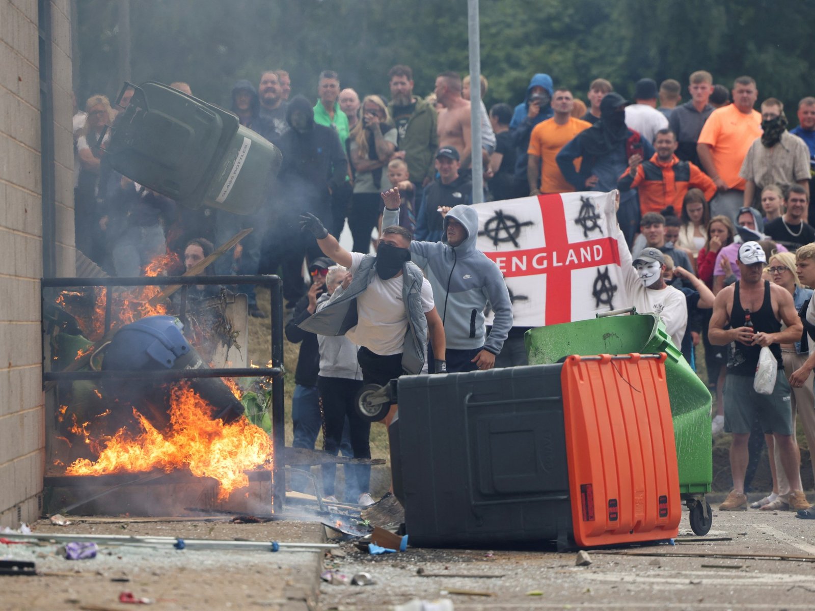 Demonstranten gooien een vuilnisbak tijdens een anti-immigratie oproer in Rotherham, VK op 4 augustus 2024.