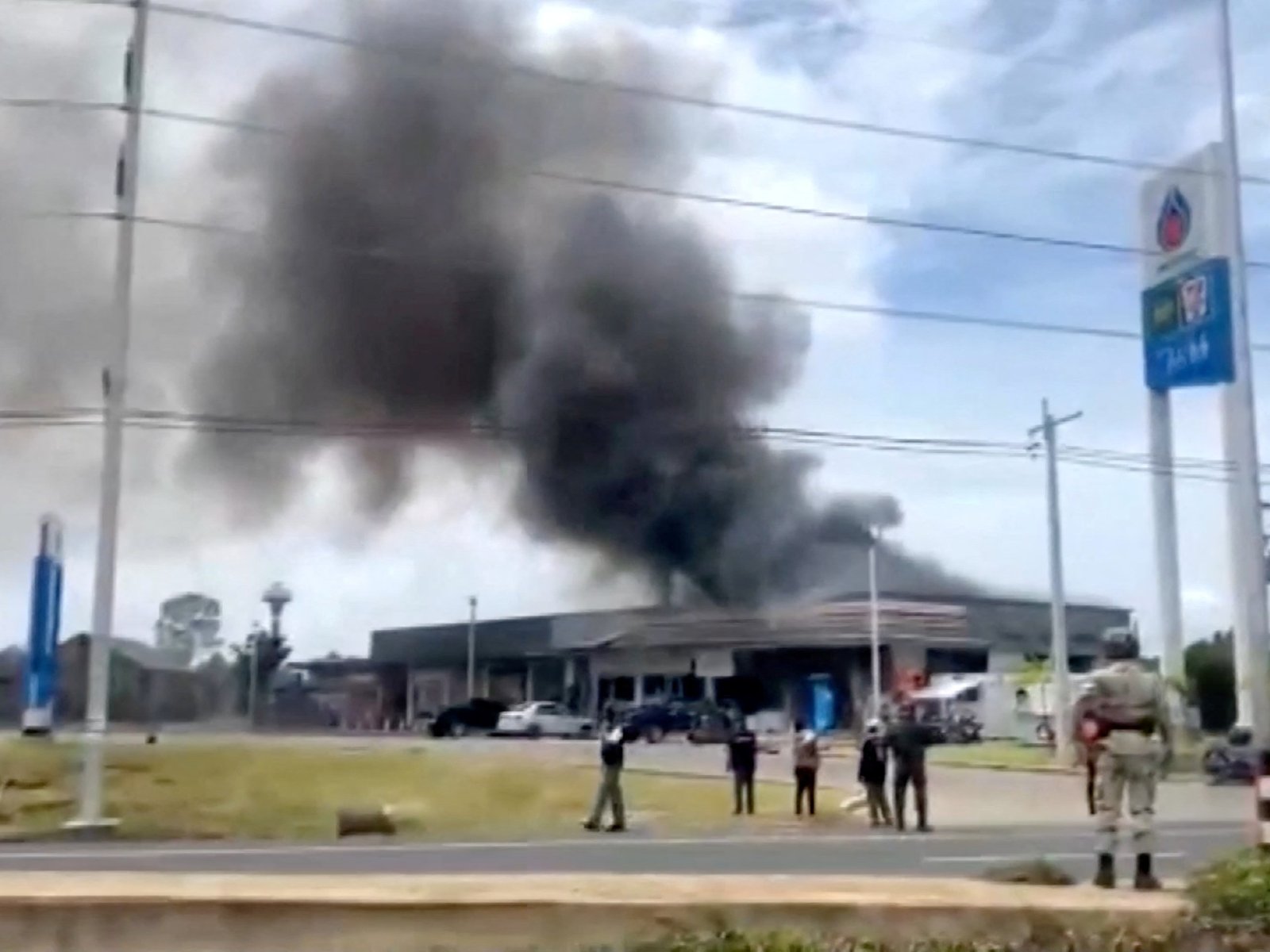 Rook stijgt op uit een gemakswinkel bij een tankstation te midden van de conflicten tussen Thailand en Cambodja in het district Kantharalak, provincie Sisaket, Thailand, op 24 juli 2025. Ten minste 16 mensen zijn omgekomen en tienduizenden zijn ontheemd, terwijl Thailand en Cambodja verwikkeld zijn in hun ergste gevechten in meer dan een decennium, waarbij zware artillerievuur over hun betwiste grens wordt uitgewisseld.