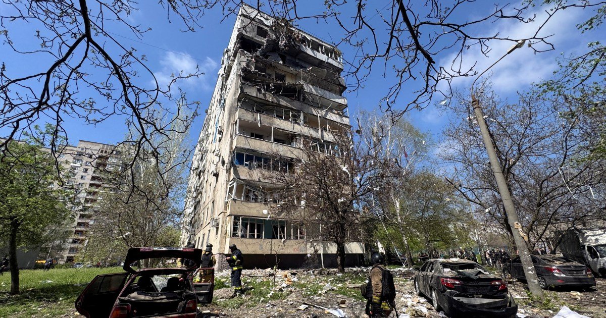 Hulpdiensten werken op de locatie van een appartementencomplex dat op 22 april 2025 door een Russische luchtaanval is getroffen in Zaporizhzhia, Oekraïne.